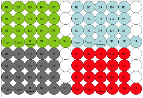 (The green, blue, grey, and red colors represent 4 separate samples. Set up the plate for the number of samples received at one time.)