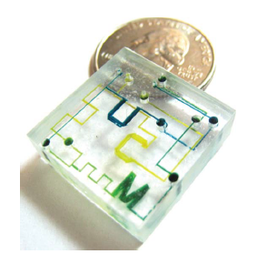 The Shrinky Dinks’ shrinking properties can be utilized for microfluidic applications. Michelle Khine’s group at the University of California Irvine investigated utilizing the shrinking properties of this commercial product in 2008 and in 2011 other shrinking plastics. This group printed the device channels onto the Shrinky Dink sheets then shrunk them down to create a device master with raised areas that can then be used for to make the device out of PDMS. This method produces rounded channels in a short period of time. Where others have taken this method and spun off further methods, such as cutting out the device design to create the channels within the Shrinky Dink sheets. Further studies looked at other materials such as polyolefin sheets. The polyolefin sheets shrink by 95% [2] where the standard Shrinky Dink plastic shrinks by 63% [1].