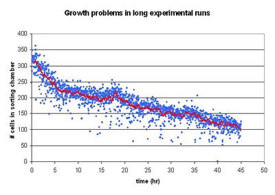 Run Failed. Cell counts were impossibly large. Images show that there were no cells present soon after run started. This is probably due to cell growth that was so slow it could not keep up with the dilution rate. A lack of oxygen could be playing a role here.