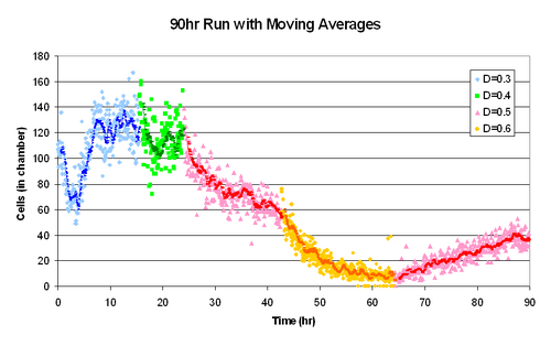 Looked pretty good. Probably should have left longer at D=0.5 (first time) to see where the SS was exactly since it looks like the cell count may still have been decreasing. Cell counts were determined by processing of FL images as shown here.