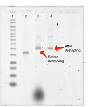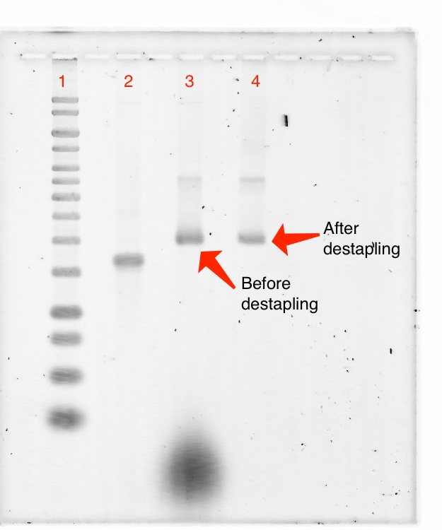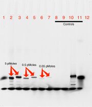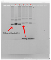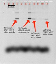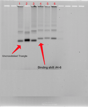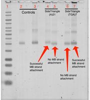 3.b)Edited Image(MZ)-Triangle binding to Methylene Blue strands and successfully displaying a gel shift (stained).jpg