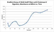 AMS 10272015 Bradford Assay of 10nM AuNP Fibers with Proteinase-K Digestion, Absorbance at 600nm vs. Time .png