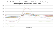 AMS 10272015 Bradford Assay of 10nM AuNP Fibers with Proteinase-K Digestion, Wavelength vs. Absorbance at Various Times .png