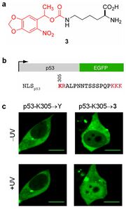 | 00:13, 5 March 2012 | CH391Lphotocaging.jpg (file) |  | 126 KB | From Riggsbee CW and Dieters A 2010 Trends in Biotechnology, used from Pubmed Central. Lysine caged within the Nuclear Localization Signal in of EGFP, inhibits nuclear localization. Upon irradiation, the EFGP relocalizes from the cytoplasm to the nucleus |