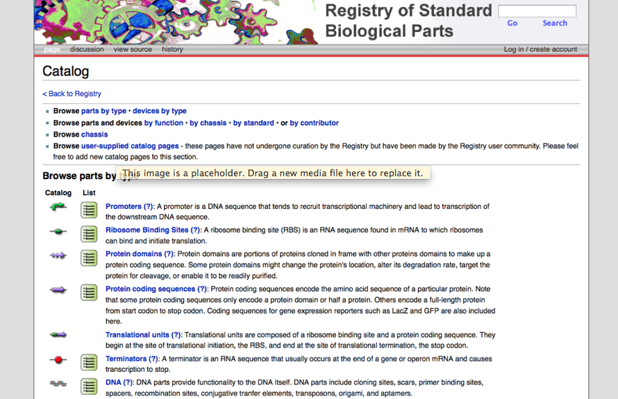 | 09:47, 28 January 2013 | Biobrick-circular-diagram.png (file) | 168 KB | A circular diagram of an actual BioBrick, bounded upstream and downstream by restriction sites, and contained within a bacterial plasmid backbone. | |