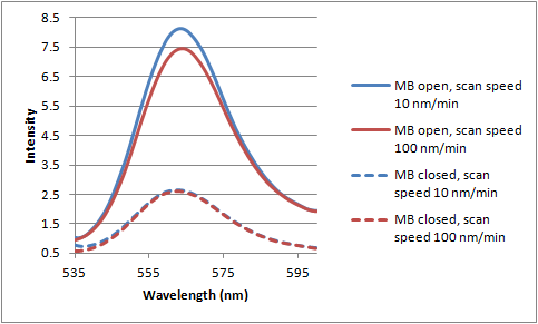 12-07-12 fluorescence of 200 nM MB scan speeds.png