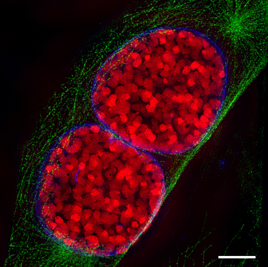 | 07:46, 3 December 2009 | 3D-SIM-3 Prophase 3 color.jpg (file) | 386 KB | Light-optical section through two mouse cell nuclei in prophase, recorded with 3D Structured Illumination Microscopy (3D-SIM-microscopy). condensed chromosomes are red, the nuclear envelope blue and microtubuli, which belong to the cytoskeleton, are green | |