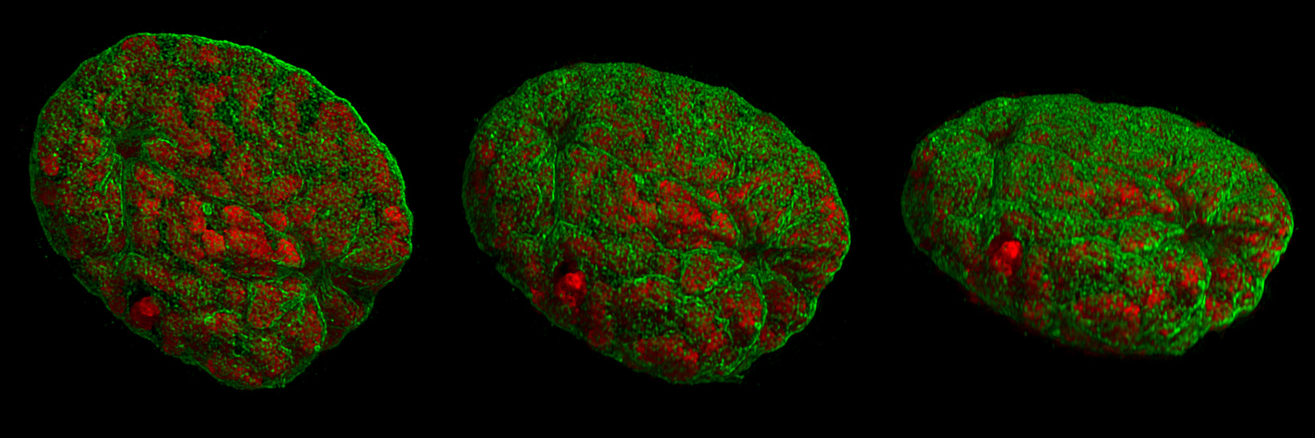 | 18:20, 3 December 2009 | 3D-SIM-2 Nucleus prophase 3d rotated.jpg (file) | 377 KB | Rotated projection views of a mouse nucleus at prophase, recorded with 3D-SIM. The chromosomes, stained with DAPI, are shown in red; the nuclear lamina is shown in green. Protrusions of the nascent spindle into the lamina are visible at both poles. | |