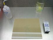 | 18:43, 3 August 2010 | Gel excision.JPG (file) | 38 KB | Water bottle, Lexan sheet used as surface, and box of razor blades, all shown in a laminar flow hood to reduce potential contaminants to each excised band | |