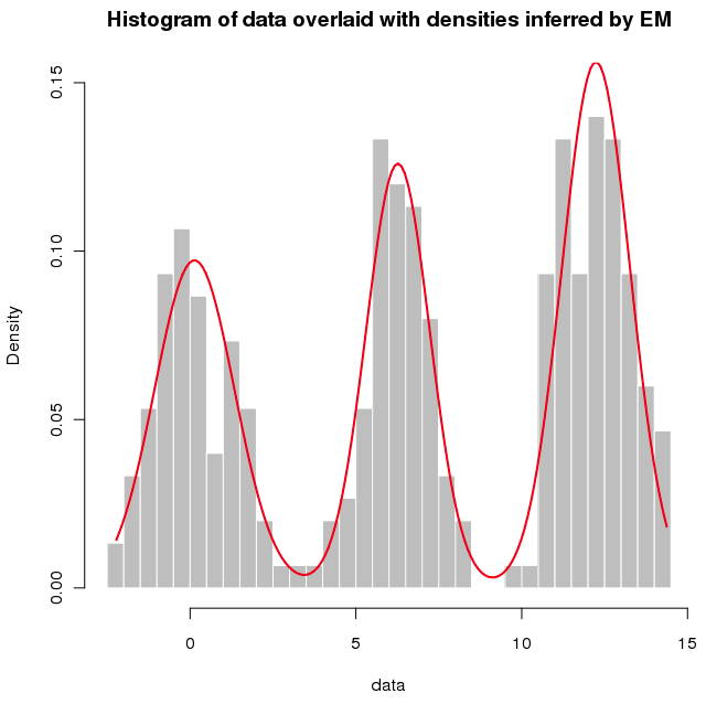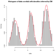 | 20:53, 3 January 2012 | Mixture univariate em.png (file) | 46 KB | Histogram of simulated data overlaid with density estimate obtained by fitting a mixture of 3 normal components using the EM algorithm. | |