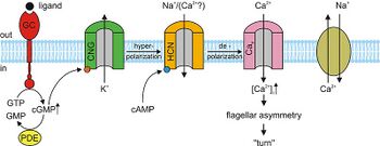 [7] Kaupp UB, Solzin J, Hildebrand E, Brown JE, Helbig A, et al. 2003. The signal flow and motor response controling chemotaxis of sea urchin sperm. Nat. Cell Biol. 5:109–17 19, 20. Evidence that in sea urchin sperm even a single molecule of chemoattractant can initiate a cGMP-signaling pathway: Elevation of cGMP leads to a hyperpolarization caused by the opening of K+-selective cGMP-gated ion channels, followed by Ca2+ entry.