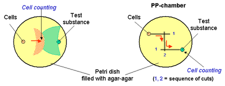 Agar or gelatine lined plates can also be used for chemotactic assays. Cells and test substances are injected onto the surface and the cells moving towards the test substance are then. Counted. In the PP-techniques, channels are cut between the cells and the test substance and the cells are counted near the test substances.