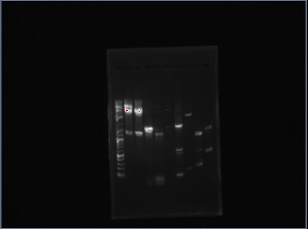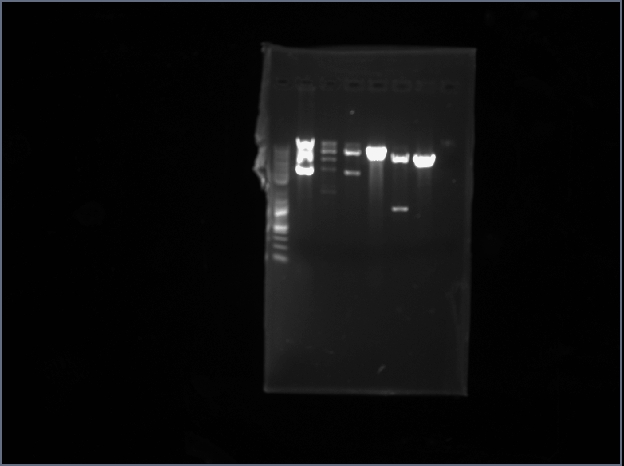 Ghost banding makes analysis difficult. Previous analysis suggests that Ser1 is correct and Arg1 is probably correct. The Vect is meant to be uncut, and the Arg vector is meant to have a roughly ~5kb and ~500bp fragment. Under UV there appears to be a very feint 500bp band within the streak, it's visible in the image but only slightly. The part is present in Arg1, but importantly there is definitely something wrong with the digestions for pure vector (that notably weren't present when Ser was prepared or compared to) and this has remained unresolved.