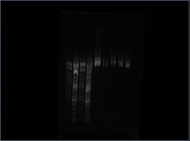Run final gel to prove (instead of speculate about ghost banding) for sequencing. Accidentally loaded lanes 2,3,4 with ladder instead of loading dye. Someone altered voltage to 180V and melted my gel mid run. No useful results: