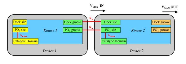 - The Docking Groove of the upstream kinase (e.g. Device1) binds to the Docking Site of the downstream kinase (e.g. Device2).