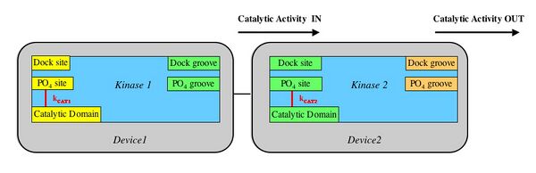 - The signal passed between devices is some sort of catalytic activity of one kinase for another.