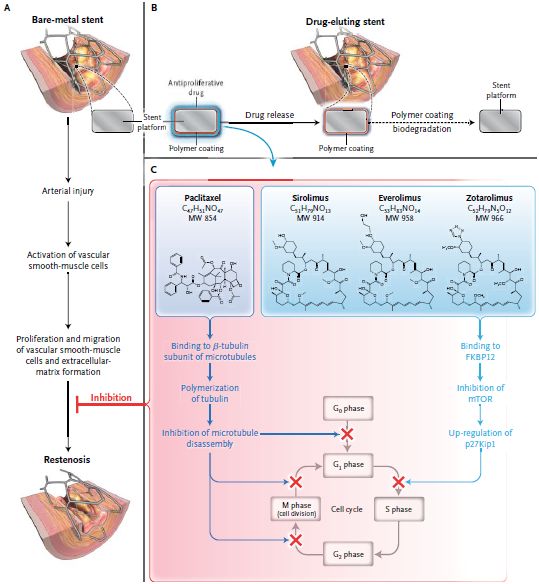 New generation stents release everolimus and zotarolimus [1]. These stents are promising in that they reduce the risk of thrombosis, one of the drawbacks of their first generation counterparts. Clinical trials have demonstrated that everolimus reduces the risk of repeat revascularization, heart attack, and stent thrombosis compared to paclitaxel and sirolimus eluting stents [1]. Compared with paclitaxel, zotarolimus reduces the risk of myocardial infraction [1].