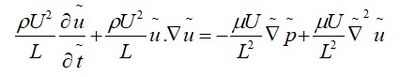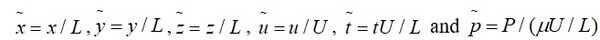 where, P is the characteristic pressure, U is the characteristic velocity, L is the characteristic length, and all the terms with ~ represents the dimensionless variables. Next, we need to substitute these dimensionless variables into equation 1.1 which yields the following relation,