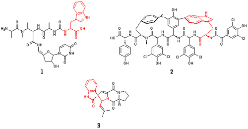 The antibiotic pacidamycin (Figure 1) (Streptomyces coeruleorubidus), the HIV-1 integrase inhibitor complestatin (Figure 2) (Streptomyces lavendulae), and the potential antitumor agent spirotryprostatin (Figure 3) (Aspergillus fumigatus) all contain a tryptophan moiety.