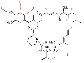 Due to its efficacy in binding proteins FKBP12 and the rapamycin associated binding protein (FRAP), rapamycin (Figure 4) (Sirolimus) is used clinically as an immunosuppressant. Crystal structure analyses have shown that a crucial hydrogen bond exists between Gln53 of FKBP12 and the hydroxyl group on the substituted cyclohexane ring of rapamycin. Glu54 is also proximal to this moiety. Modifications to the cyclohexane ring will alter these bonding interactions and could potentially have a beneficial affect on rapamycin's immunosuppressive properties. Rapamycin is biosynthesised by Streptomyces hygroscopicus. This organism has demonstrated low substrate specificity in its selection of a starter unit, the substituted cyclohexane carboxylic acid. A range of fluorinated cyclohexanoic acids are being synthesised for incorporation studies into rapamycin. Similar studies are being performed with the polyketide antibiotic erythromycin. Crystallographic studies of novel rapamycin analogues with FKBP12 and FRAP will be undertaken.