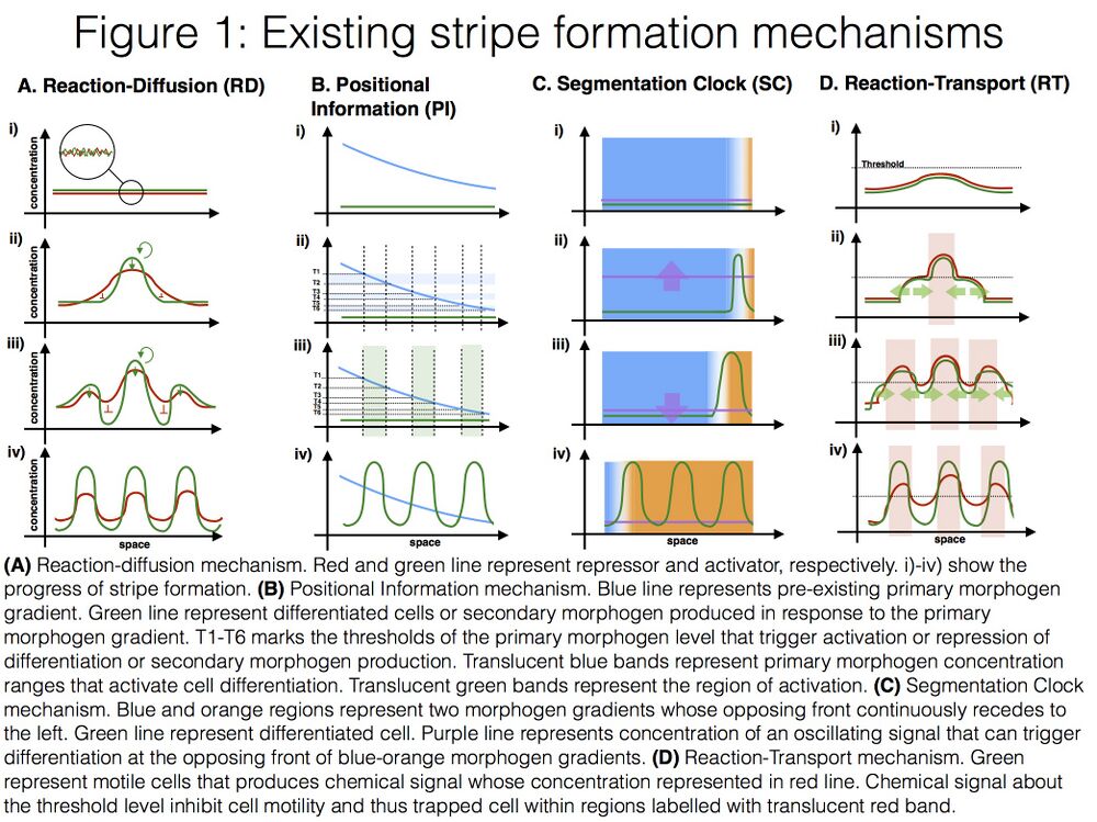 Another possible mechanism is to use segmentation clock (SC) to convert the temporal oscillation of a biochemical pacemaker into the periodic spatial pattern [Cooke1976] (Fig 1C). Similar to Wolpert’s original PI model, SC model needs an anisotropic initial condition, i.e., the presence of centralised pacemaker somewhere on pattern forming domain. However, SC generates repeating stripes sequentially using the same repeating process. This feature is more similar to RD model and not PI model which requires different stripes to respond to different morphogen levels. Yet, the other mechanism for generating stripes relies on reaction and transport (RT) of pattern forming agents [Liu2011] (Fig 1D). RT may be taken as a generalised RD. In Turing’s original RD model, pattern forming agents (e.g., morphogens) regulate one another’s production or degradation while their transport rate (e.g. diffusion coefficients) remain constant. In RT model, pattern forming agent may regulate one another’s production, degradation or transport rate. For instance, the first synthetic RT system by Liu et al has bacterial cell functions as a pattern forming agent whose transport rate (i.e. motility) is regulated by another pattern forming agent, AHL. Since individual cells produce AHL, the net AHL production at any location is positively regulated by cell concentration. Together, Liu et al system couples cell motility to cell density and consequently allows stripe pattern to emerge. Like Turing’s original RD system, RT system can break symmetry of isotropic initial condition and does not require centralised morphogen sources or pacemakers.