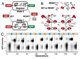Synthetic biology promises to replace ad hoc small scale DNA engineering with formalized processes applied to realize much larger scale changes in genotypes and more radical changes in phenotypes. Our work here describes design principles and demonstrates applications of a recombinase device family to provide examples for how to compose reliable synthetic gene systems. This work includes: a) computational feasibility studies of synthetic cycle counter an example of complex synthetic gene systems requiring hundreds of genetic parts, b) experimental proof-of-concepts, failure analyses and design principles for a Recombinase Addressable Data (RAD) device built from bacteriophage integrases and excisionases. Our RAD devices are capable of storing state over one hundred cell generations and can be switched repeatedly, c) generalisation of rewritable RAD principles to three other integrase-excisionase pairs, and implement single-use two input logics, buffer gates and cascades, d) Implementation of autonomous recombinase switches driven by growth-phase dependent promoters. Taken together,the work developed here comprises an initial framework for composing complex yet reliable genetic systems using recombinase enzymes. This project was conducted at the laboratory of Prof. Drew Endy (Stanford University, USA)