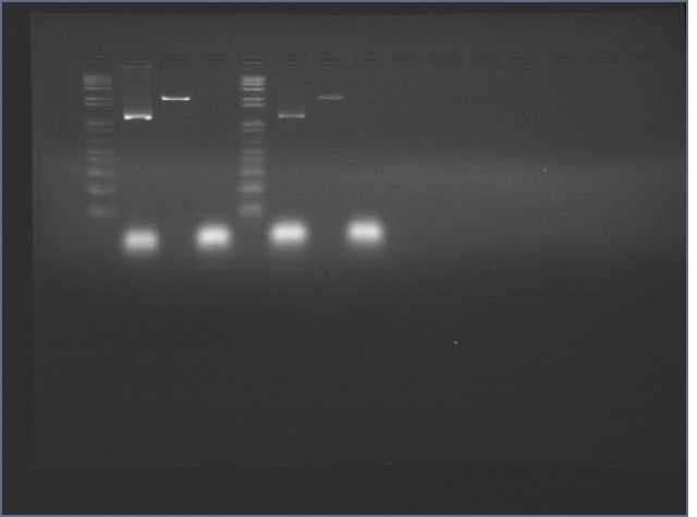 Ran gels from nanostructure incubations yesterday. 2% agarose gel, 130V, 45min. Loaded 10ul sample + 1ul dye, and 10ul 1kb ladder.
