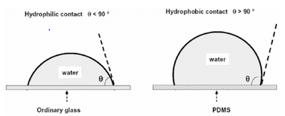 In application to microfluidics, PDMS (silicone) is typically hydrophobic while glass is hydrophilic. Both of these are typical substrates used in microfluidic devices.