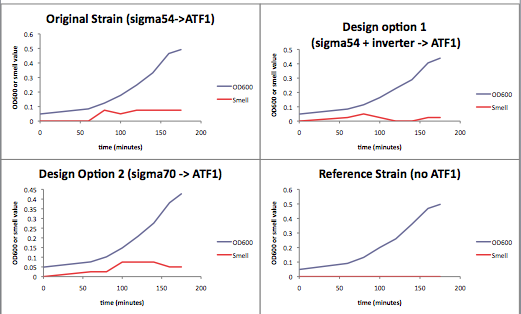 TEACHERS: Note that the original strain is supposed to smell like bananas only during stationary phase but we have found that it actually smells throughout the measurements we've made...perhaps because stationary phase activity starts earlier than we think. Similarly, we have seen the strain 1-2, which has the stationary phase promoter and the inverter, is more active throughout the growth curve and generates a stronger banana smell than strain 1-3, which has the log phase promoter.