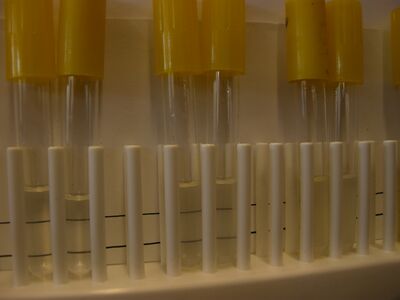 11. After 20 minutes, remove 1-2 ml from each sample and place in a cuvette. Note: the volume you use here will depend on the size of the cuvette appropriate for your spectrophotometer. Please follow the teacher's instructions. TEACHERS: 1 ml is sufficient for a small plastic cuvette, while 2 mls will be needed for a small test tube that fits into most Spec 20 spectrophotometers