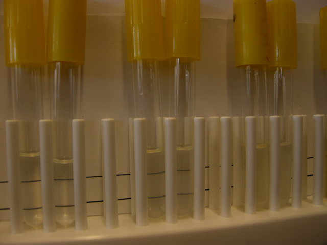 Following your teacher's instructions, obtain small clear test tubes containing the turbidity standards. The tubes should contain enough standard in each to fill the tube to a height of about 1 inch (2.5 cm) from the bottom. Make sure each tube is properly labeled with its turbidity standard number. If you are filling the tubes from stock bottles of the standards, use small tubes and place enough standard in each to fill the tube to a height of about 1 inch (2.5 cm) from the bottom.