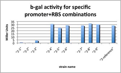 Note that the current set of strains (2-1 through 2-9) have "weak" and "strong" promoters behaving nearly identically. There is a new set of "very strong" promoters being built that will offer a greater range of units. This can be a way to illustrate the "design-build-test" paradigm in engineering and a way to illustrate the utility of scientific understanding to help guide the redesign cycles.