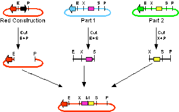 The construction plasmid is cut with EcoRI (E) and PstI (P). The prefix part is cut with EcoRI (E) and SpeI (S). The suffix part is cut with XbaI (X) and PstI (P). The resulting linearized DNA pieces are then ligated together and transformed. The transformed cells are plated on plates supplemented with the antibiotic corresponding to the red plasmid.
