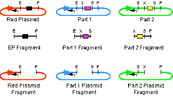 - The blue plasmid contains part 1 or the prefix part.