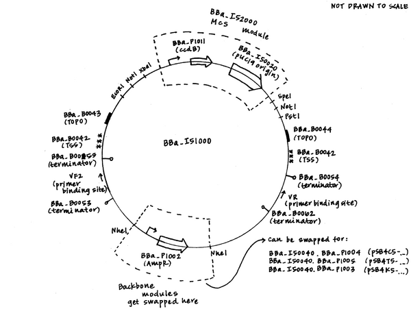 Note that BBa_P1011 and BBa_I52000 encode ccdB, a toxic gene to E. coli, and therefore will only propagate in special strains which have a mutation that confers resistance to ccdB (i.e. DB3.1). BBa_I52000 is the insert present in the vector scaffold. We will not ask for the BBa_I50020 and BBa_P1011 as separate pieces in BioBricks format but they could later be generated by PCR.