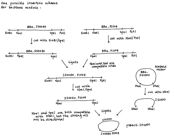 - Modular scaffold design so that new vectors can be constructed in the future. (Replications origin and resistance marker should be assembled together in BioBricks form and cloned via the NheI sites into the vector scaffold).