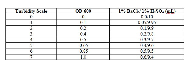 The OD 600 can be estimated using Turbidity Standards. This method uses suspensions of a 1% BaCl2 in 1% H2SO4 at various concentrations and is modeled after the McFarland Turbidity Scale. These suspensions appear visually similar to suspensions of various populations of E coli.