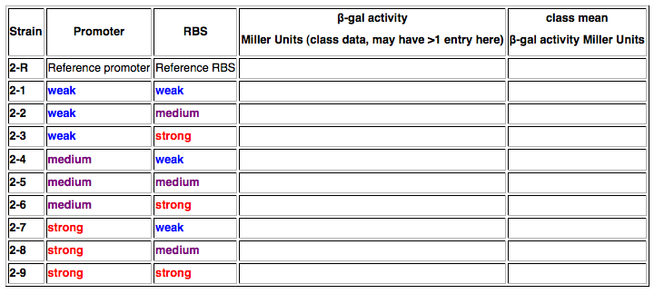 Data TableIn your lab notebook, you will need to construct a data table as shown below. If you are testing only a subset of the promoter and RBS collection, be sure to note which ones you are investigating: