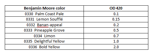 The OD 420 can be estimated using Benjamin Moore paint chips. It is impossible to accurately reproduce these chips online. Color chips will be provided by your instructor.