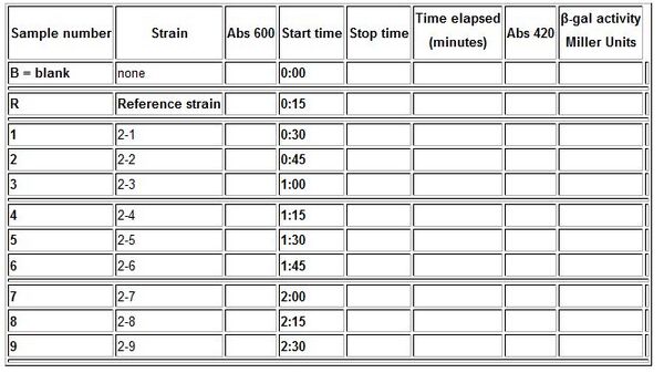 With this assay you will determine the amount of beta-galactosidase activity associated with each sample of cells. As a class you should try to perform replicate assays of each sample (so each strain gets measured two or three times) and then pool your class data to gain some confidence in the values you measure. A data table is included to help you organize your assay, but you can make one of your own if you prefer. Note that the volumes here are given for spectrophotometers that use glass test tube cuvettes.