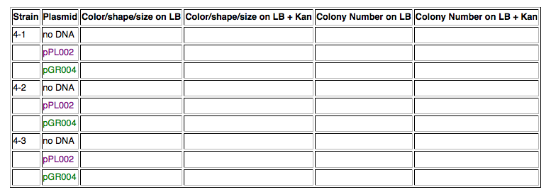 Label the LB and LB + Kan petri dishes *on the bottom* (not the lids). Be sure to include the strain, plasmid, media and member names.