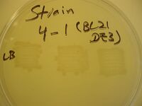 With a sterile dowel scrape a patch of the bacterial strain 4-1 off the LB agar plate and into one of the TB aliquots, swirling the dowel to remove the cells from the dowel into the solution. Discard the dowel in the contaminated waste bin.