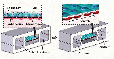 The lung on a chip is constructed primarily of poly(dimethylsiloxane) (PDMS), a soft, partially elastic polymer, that has been patterned through soft lithography techniques typical of nanotechnology and microfluidic devices. Two pieces of a PDMS slab are patterned with three different channels about ten microns in width. These two PDMS slabs are sandwiched around a thin PDMS membrane that has been patterned with pentagonal pores. The three pieces of PDMS are fused together to create three microfluidic channels that are divided down the middle by the porous PDMS membrane. The outermost channels are exposed to a PDMS etching compound that etches away part of the exposed PDMS surface, including the entire membrane. These outermost channels are the vacuum channels that will cause the PDMS chip to expand and contract similar to natural lung tissue. The middle channel that remains with its porous membrane intact is where the gas exchange takes place. Human lung epithelial cells are seeded onto the top layer of the chip and they adhere to the sides of this channel including the porous PDMS membrane while they are exposed to air. On the opposite side of the membrane, human endothelial cells are seeded on to the membrane and channel surface while a blood modeling media is flowed through. The vacuum channels will be connected to a computer driven vacuum pump that will cause the central channel and it’s membrane to expand and contract, while microfluidic pumps model the flow of air and blood through the central channel on either side of the membrane [3].
