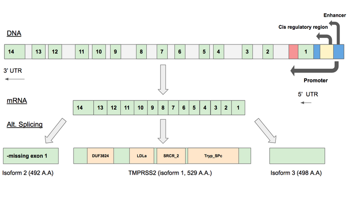 - Gene map diagram and Isoform 1 of TMPRSS2. TMPRSS2 is located on Chromosome 21 at q 22.3. It has an enhancer, regulatory region, and promoter located before the transcribed portion of the gene. After splicing, there are 14 exons in Isoform 1. Each of the SNP amino acid substitutions are plotted along Isoform 1, which contains 4 domains.