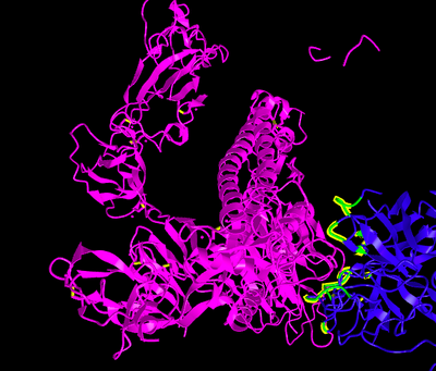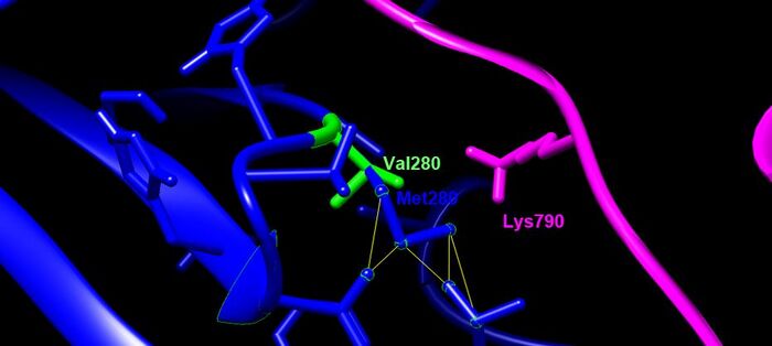 - blue= TMPRSS2, SARS-CoV-2= magenta, green residue indicates wildtype (V280), blue residue is the mutation (M280)