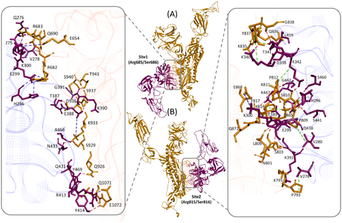 Figure 2. TMPRSS2 and SARS-CoV-2 spike protein Molecular Complex. Ribbon diagram of complexes between TMPRSS2 (magenta) and SARS-CoV-2 spike protein (gold) for (A) site1 (Arg685/Ser686) and (B) site2 (Arg815/Ser816), residues of TMPRSS2 (magenta sticks) and spike protein (gold sticks) involved in the intermolecular interactions are shown in the respective boxes. PDB files of the complexes are made available in supplementary materials Model and Complexes.