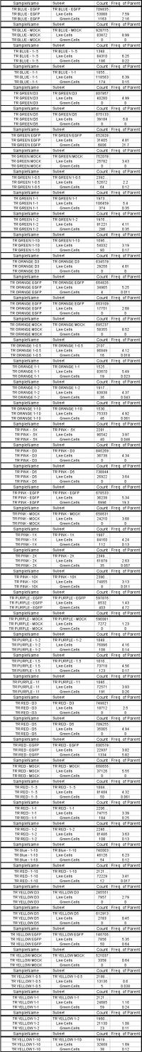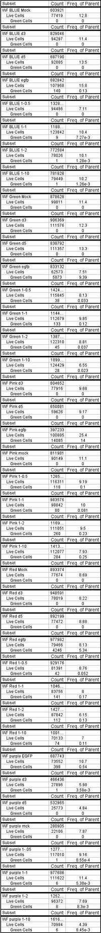 Don't forget to average a few groups together. Everyone think about (and write about) why it was important to include the D3 and the D5 controls. The percentage of parent for the green cells is the percent of live cells that is green. This is the important number!