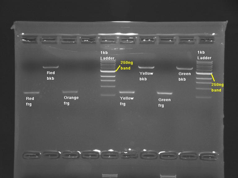 Orange Team: In regards to your missing backbone, you might have too little backbone in the beginning or you've mistakenly discarded your backbone during gel purification process. Don't worry, you can certainly ask your neighbors or another group for some of their backbone to do ligation in the next lab. There should be plenty to use for everyone!