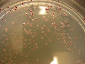 Before we move to Journal club today, you and your partner should choose two candidates from your electroporation plates. To choose your candidates, try to find reasonably well isolated colonies to compare so you will have a clonal population to study. Then look for colonies of about the same size but different colors. The size of the colonies matters since very small colonies may not have metabolized as much lactose based simply on their reduced number of cells rather than the activity of the signaling pathway in that cell.