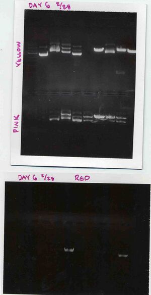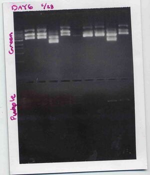 Many of the gels today did not have a visible ladder (the protocol was an old one that said to use only 5 μL - sorry about that). A few gels - for blue, and to a large extent purple and red - also seemed to indicate little DNA recovery from the minipreps.